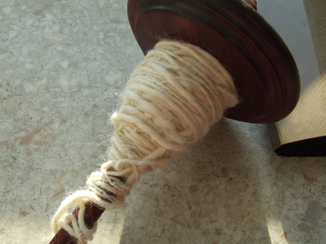 Dostałam ostatnio na imieniny od Współspacza (termin ukuty przez moją Rodzicielkę :D) wrzeciono Kromskiego - w końcu je złożyłam, wyszlifowałam rowek na nitkę i uprzędłam pierwszą wełenkę. Nie jestem pewna, czy nadaje się to do czegokolwiek, bo szerokość waha się od około palca do około milimetra, i wszystko przekręcone, więc traktuję to jako wprawkę :D A pod wrzecionkiem książka, którą nabyłam za trzy złote na bibliotecznej wyprzedaży (rzeczy, które znaleźć można na kocim forum, nigdy nie przestaną mnie zadziwiać!). Szczerze polecam, napisana przez mineralożkę oraz historyczkę, bardzo przystępna i przerażająco ciekawa.